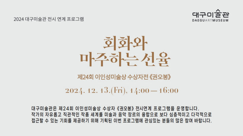 사진 제공 대구미술관대구미술관은 12월 13일 오후 2시에 2024년 이인성 미술상 수상자 '권오봉'과 관련한 연계 교육 '회화와 마주하는 선율'을 합니다. 권오봉 작가의 리듬감 풍부한 직관적 회화 세계를 클래식 음악을 통해 이해하려는 목적으로 기획됐습니다. 조희창 음악 평론가의 해설과 함께 '슈베르트 즉흥곡 3번', '...