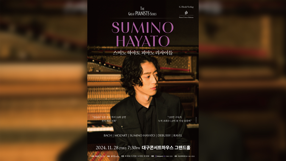 유튜브에서 명성을 얻은 일본 출신 작곡가 겸 피아니스트 스미노 하야토가 대구에서 공연을 합니다. 스미노 하야토는 11월 28일 저녁 7시 30분 대구콘서트하우스 그랜드홀 무대에서 바흐의 '전주곡과 푸가 다장조'에 이어 자작곡 '태동'과 야상곡, 그리고 직접 편곡한 터키 행진곡 변주곡 등을 연주합니다.일본 전국 투어에...