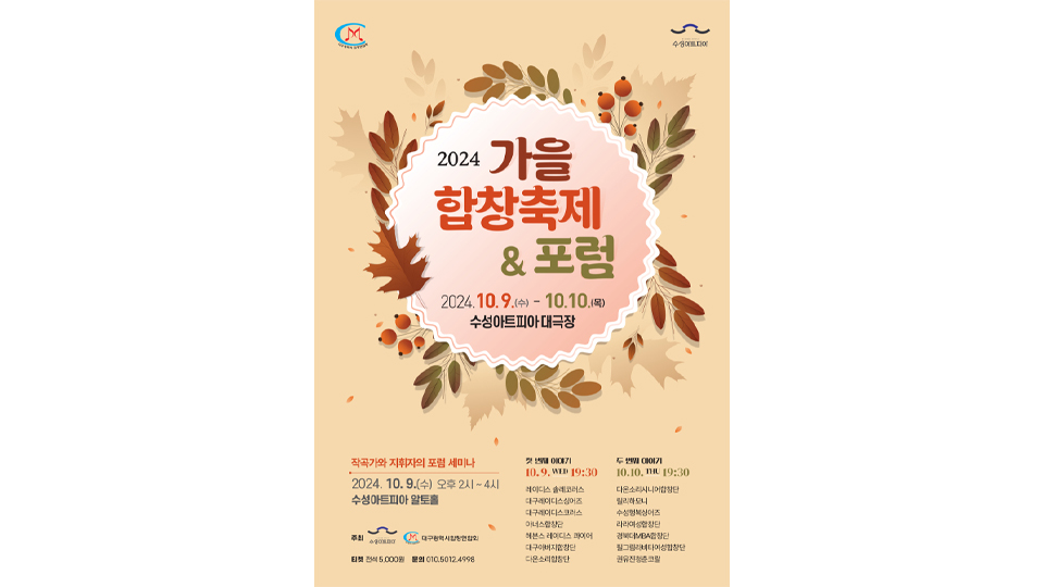 대구 수성아트피아는 2024년 두 번째 합창제 '가을 합창 축제'를 10월 9일과 10일 이틀간 저녁 7시 30분에 엽니다. 대구시 합창연합회와 함께하는 공연은 합창단 14개가 출연합니다. 첫째 날에는 대구아버지합창단, 다온소리합창단 등이, 둘째 날에는 다온소리시니어합창단, 수성행복싱어즈, 릴리하모니, 라라여성합창단 등...