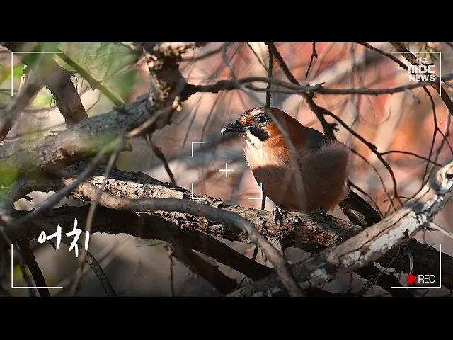 까마귀과에 속하는 어치는 우리나라 전역에 분포된 비교적 흔한 텃새입니다. 하지만 예민하고 급한 성격 때문에 도시가 아닌 깊은 산속에서 주로 서식합니다. 대담하고 호기심이 많으며 사납고 공격성이 강한데요, 도토리 등 나무 열매나 곤충은 물론 다른 새의 알과 새끼까지 잡아먹는다고 합니다. 2022년 11월 16일 대구...