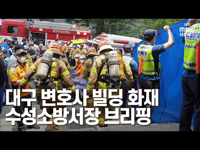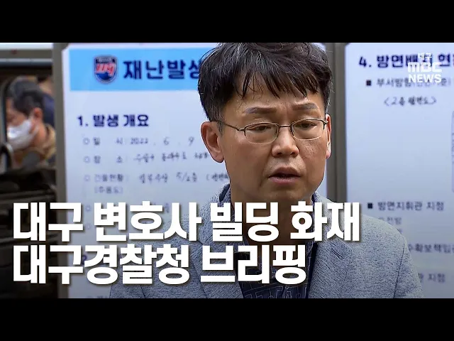 대구청 강력계장 정현욱입니다. 오늘 현주건조물 방화 치사 사건에 대한 간단한 사건 개요를 설명드리겠습니다.사건은 오늘 10시 55분경에 수성구 법무빌딩 내에서 1명이 불상의 방법으로 방화로 추정되는 화재 사건이 발생하였습니다. 이로 인해서 40명의 부상자가 발생했고 여자 2명 남자 5명의 사망자가 발생하였습니다....
