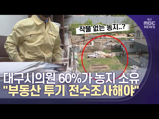 ◀앵커▶본인이나 가족 가운데 농지를 소유한 대구시의원은 18명으로 절반이 넘습니다.직접 농사를 짓지 않는 경우가 대부분일 텐데요 부동산 투기가 의심되는 정황이 적지 않습니다. 대구시 공무원과 지방 공기업은 물론 국회의원들까지도 부동산 투기 전수조사를 받았습니다.다른 일부 지방의회도 마찬가지입니다. 하지만 ...
