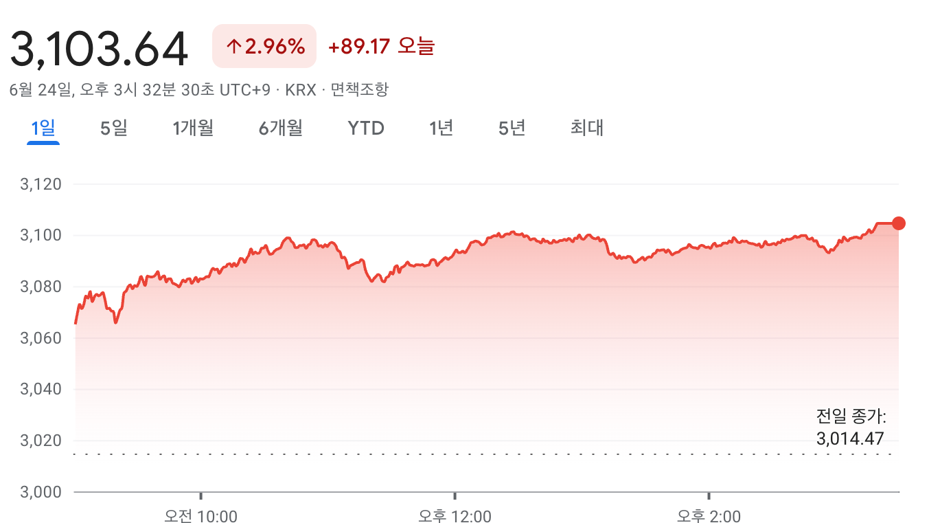 이스라엘과 이란의 휴전 소식으로 코스피가 3% 가까이 급등하면서 3년 9개월 만에 3,100선을 돌파했습니다.6월 24일 코스피 지수는 전날보다 89.17포인트, 2.96% 폭등한 3,103.64로 장을 마쳤습니다.코스닥 지수도 전장보다 16.14포인트, 2.06% 오른 800.93으로 거래를 마감했습니다.코스닥 종가가 800선을 돌파한 건 2024...