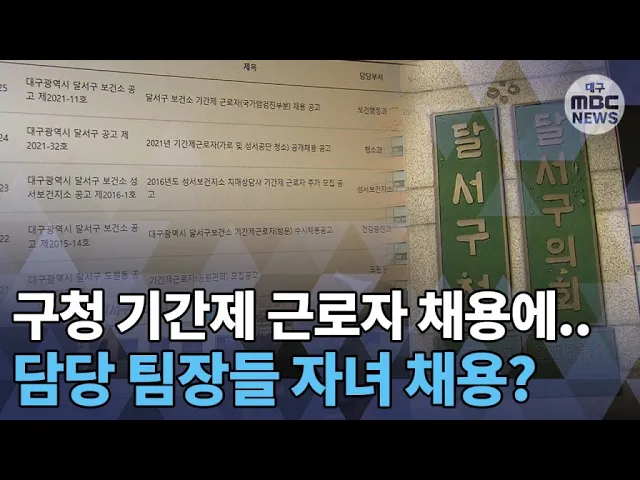 ◀앵커▶ 대구 달서구청에서 세 명을 채용하는 기간제 근로자 중 두 명을 그 업무를 담당하는 과 팀장들의 자녀로 뽑은 사실이 드러나 물의를 빚고 있습니다. 일자리를 구하기 위해 하루 24시간을 매달리는 취업 준비생들에겐 분통이 터질 일입니다. 윤영균 기자가 취재했습니다. ◀영상▶ 대구 달서구청...