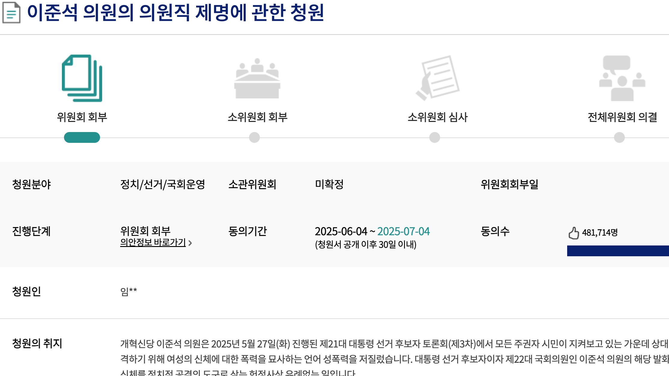 지난 대선 TV 토론에서 성폭력성 발언을 한 개혁신당 이준석 의원을 제명해 달라는 국회 국민 청원 동의자 수가 엿새 만에 48만 명을 넘겼습니다.6월 4일 한 시민이 국회 국민 동의 청원 사이트에 개혁신당 이준석 의원의 의원직을 제명해 달라는 청원을 올리면서, 대선 3차 TV 토론에서 당시 이준석 후보가 성폭력을 묘사...