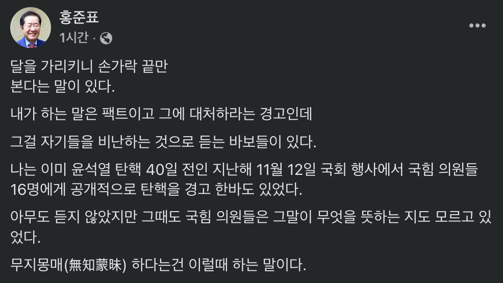 홍준표 전 대구시장이 이재명 대통령이 이른바 3대 특검법을 의결한 것을 두고 국민의힘을 향해, "특검 끝나면 정당 해산 절차에 들어갈 것으로 보이니 각자도생할 준비들이나 하라"고 비꼬았습니다.홍 전 시장은 6월 11일 SNS에서 "달을 가리키니 손가락 끝만 본다는 말이 있다"며 "내가 하는 말은 팩트이고 그에 대처하라...