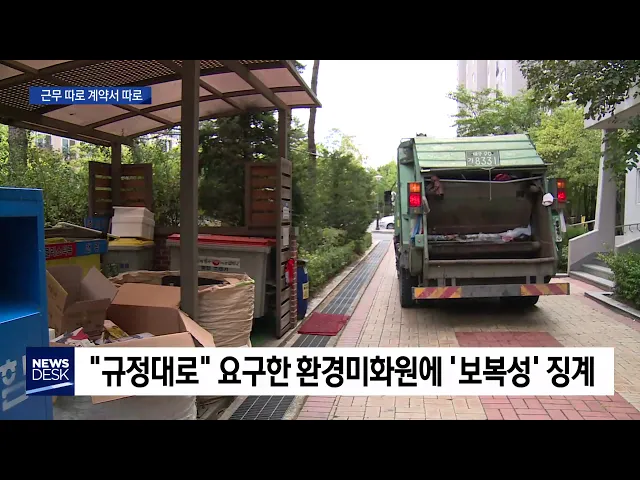 ◀ANC▶ 저녁에 집 앞에 내놓는 생활 쓰레기, 아침에는 말끔히 치워져 있죠.. 환경미화원들이 밤새 치우기 때문인데, 사실 이들의 계약서를 보면 낮에 근무하는 것으로 되어 있습니다. 실제 근무와 계약서가 따로 노는 환경미화원 문제, 윤영균 기자가 집중 취재했습니다. ◀END▶ ◀VCR▶ (s/u) "저는 지금 대구시 달서...