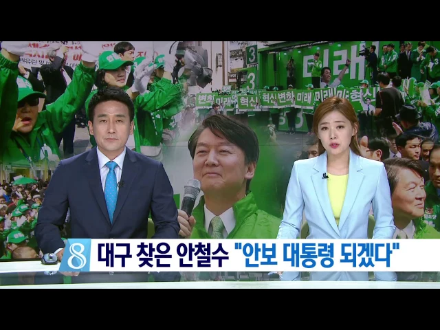 ◀ANC▶ 과거 대통령선거와 달리 대구지역에서 뚜렷하게 지지를 받는 대선후보가 없는 가운데 유력 대선후보들의 대구행이 잇따르고 있습니다. 어제는 문재인, 홍준표 후보에 이어 오늘은 안철수 후보가 대구를 찾아 안보를 강조하며 보수 표심에 호소했습니다. 자세한 내용, 정경팀 윤영균 기자와 알아봅니다. 윤기자(네...