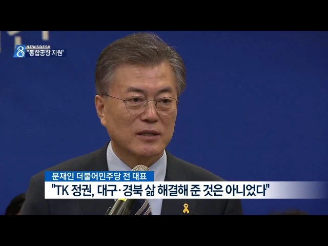 ◀ANC▶ 대선주자인 더불어민주당 문재인 전 대표가 오늘 대구를 방문해 대구경북 공약과 비전을 발표했습니다. 대구 통합공항 이전 사업과 대구권 광역철도 사업 지원, 신규 원전 건설 중단 등을 약속했는데요.. 윤영균 기자가 취재했습니다. ◀END▶ ◀VCR▶ 문재인 전 대표는 "대구의 지역내총생산은 24년 연속 전국 ...