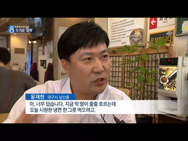 ◀ANC▶ 오늘은 중복이었는데요, 이름에 걸맞게 오늘 하루 대구,경북 대부분 지역이 올 들어 가장 더웠다고 합니다. 중복 표정을 취재한 사회팀 윤영균 기자 자리했습니다. 윤기자(네) 오늘 낮기온이 올들어 최고 기온을 기록했죠. ◀END▶ ◀윤영균▶ 네, 대구가 36.1도까지 올라 올 들어 가장 더웠고요.. 포항과 경주가 ...