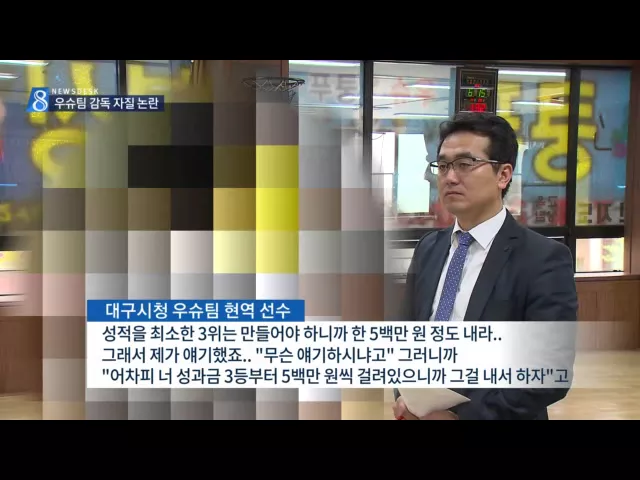 ◀ANC▶ 전국체전에 출전할 우슈 대구대표 선발전이 이상하게 치러져 논란이 일고 있다는 보도 어제 해드렸는데. 재경기를 요구한 협회측의 핵심 간부인 현 대구시청 우슈감독이 논란의 중심에 있습니다. 이 감독은 지난해부터 자질문제로 도마에 올랐는데, 현역 선수가 또, 문제를 제기하고 나섰습니다. 윤영균 기자가 취...