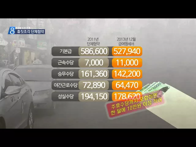 ◀ANC▶ 매일 열시간이 넘게 운전을 하지만 택시기사들의 실제 월급은 최저임금 수준에 불과합니다. 임금과 근로조건을 정한 노·사간 단체협약이 있지만, 제대로 지켜지지 않고 있습니다. 윤영균 기자가 취재했습니다. ◀END▶ ◀VCR▶ 대구에서 택시운전을 하는 김모 씨는 지난 2008년에 입사했지만 5년이 지나서야 사...