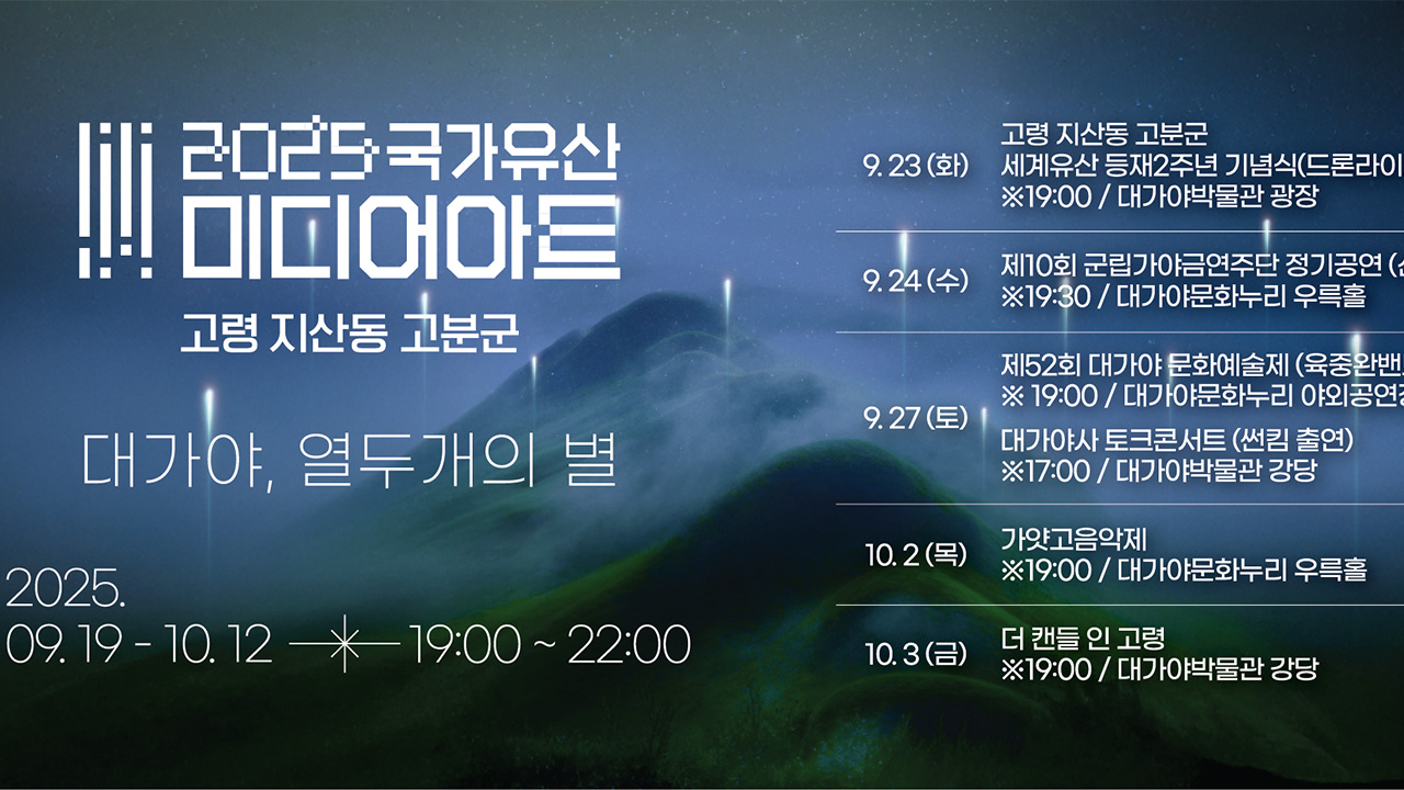 '2025 국가유산 미디어아트 고령 지산동 고분군' 행사가 9월 19일부터 10월 12일까지 매일 밤 고령 대가야박물관 일대에서 열립니다.국가유산청과 경상북도, 고령군이 주최하는 이번 미디어아트의 주제는 '대가야, 열두 개의 별'로 대가야 악성 우륵 선생이 작곡한 가야금 12곡과 고령 지산동 고분군에 담긴 대가야의 영광...
