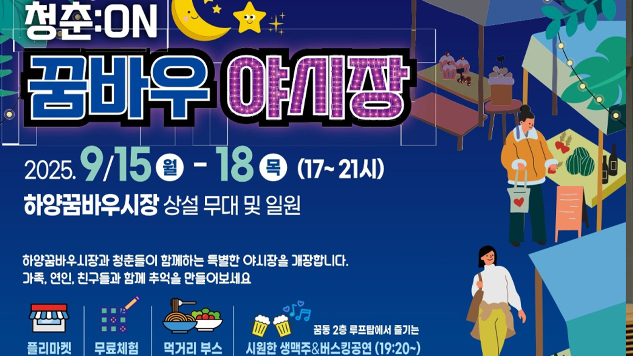 전통시장 활성화와 지역 청년과의 소통을 위한 '청춘:ON 꿈바우 야시장'이 2025년 9월 15일부터 18일까지 하양 꿈바우 시장에서 열립니다.중소벤처기업부, 소상공인시장진흥공단, 경상북도, 경산시가 주최하고, 하양 꿈바우 시장 상인회가 주관하는 이번 행사는 오후 5시부터 밤 9시까지 열리는데, 플리마켓과 다양한 먹거...