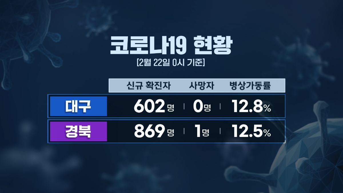 코로나 19 확진자가 감소세를 보였습니다. 2월 22일 0시 기준 코로나 19 신규 확진자는 대구 602명, 경북 869명으로, 지난주 같은 요일에 비해 대구는 243명, 경북은 55명 줄었습니다.사망자는 경북에서 1명이 나왔습니다. 코로나 19 전담 치료 병상 가동률은 대구 12.8%, 경북 12.5%입니다.집에서 격리 치료하는 사람은 대...