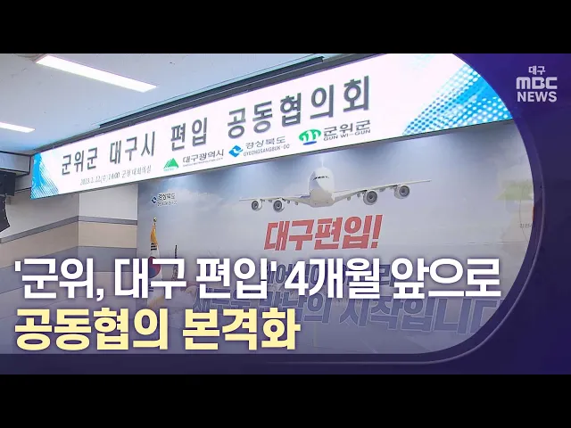 ◀앵커▶경북 군위군이 대구시 군위군이 될 날도 이제 넉 달 정도밖에 남지 않았습니다. 군위군 대구시 편입에 속도가 붙으면서 대구시와 경상북도, 군위군 모두 인수·인계 준비에 여념이 없습니다.이들 3개 지자체 부단체장은 2월 22일 첫 공동협의회를 가졌는데요,편입 과도기에 행정 서비스 공백이 없도록 협조하기로 하는...