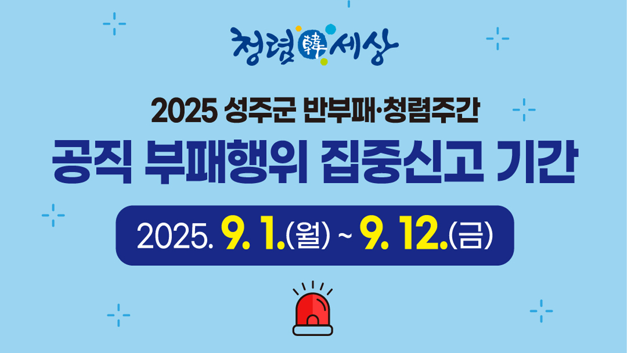 경북 성주군이 9월 1일부터 12일까지 공직자 부패 행위에 대한 신고를 받습니다.신고 대상은 공직자의 직무와 관련한 부정 청탁이나 금품·향응 수수, 공직자의 직무 관련 사적 이익 추구, 공무원 행동강령 위반 등 공직 부패 행위입니다. 신고는 성주군 홈페이지 공직자 부조리 신고를 통해 온라인으로 하거나 성주군청을 ...