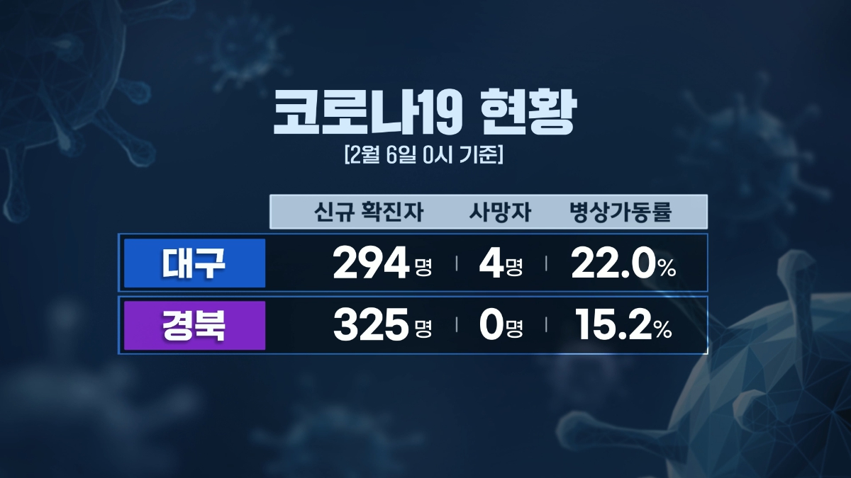 코로나 19 확진자의 감소세가 이어졌습니다.2월 6일 0시 기준 코로나 19 신규 확진자는 대구 294명, 경북 325명으로 지난주 같은 요일에 비해 대구 28명, 경북은 144명 줄었습니다.사망자는 대구에서 4명 나왔습니다. 코로나 19 전담 치료 병상 가동률은 대구 22%, 경북 15.2%입니다.집에서 격리 치료하고 있는 사람은 대구...