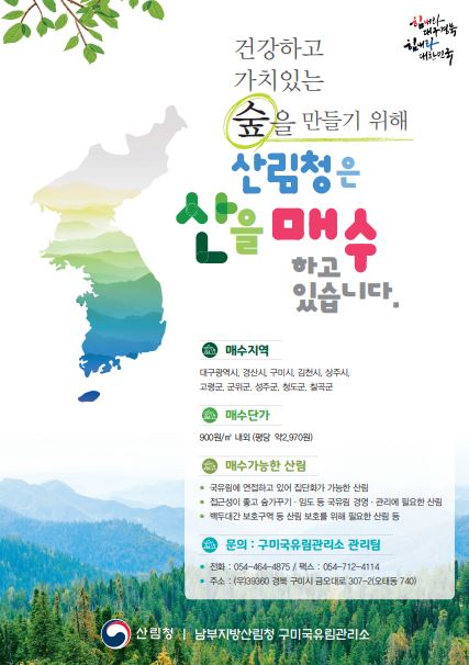 구미국유림관리소가 탄소 흡수원 확보와 지속 가능한 산림 경영을 위해 개인이 가진 산을 사들입니다.대상 지역은 대구와 경산, 구미, 김천, 상주, 고령, 군위, 성주, 청도, 칠곡으로, 250.1ha의 산을 일시 지급형과 분할 지급형으로 사들입니다.일시 지급형은 대금을 한 번에 지급하는 것으로 국유림 인근에 있어 국유림 ...