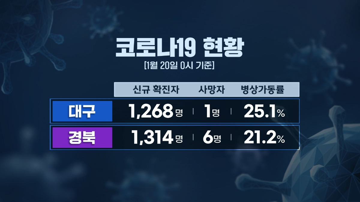 코로나 19 확진자의 감소세가 이어졌습니다. 1월 20일 0시 기준 코로나 19 신규 확진자는 대구 1,268명, 경북 1,314명으로, 지난주 같은 요일에 비해 대구는 456명, 경북은 520명 줄었습니다.사망자는 대구에서 1명, 경북에서 6명 나왔습니다.코로나 19 전담 치료 병상 가동률은 대구 25.1%, 경북 21.2%입니다.집에서 격리 ...