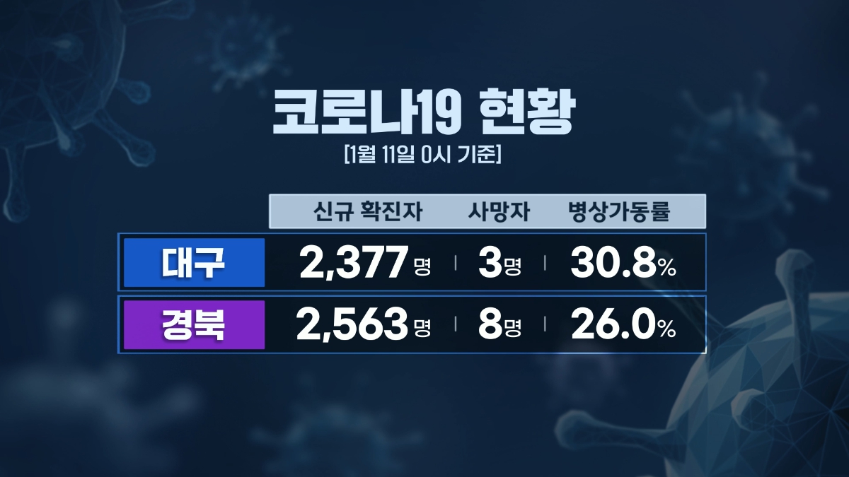 코로나 19 확진자는 큰 폭으로 줄었지만, 사망자는 이틀 연속 11명 나왔습니다.1월 11일 0시 기준 코로나 19 신규 확진자는 대구 2,377명, 경북 2,563명으로, 지난주 같은 요일에 비해 대구는 773명, 경북은 1,153명 줄었습니다.하지만, 사망자는 대구에서 3명, 경북에서 8명 나왔습니다.코로나 19 전담 치료 병상 가동률은...