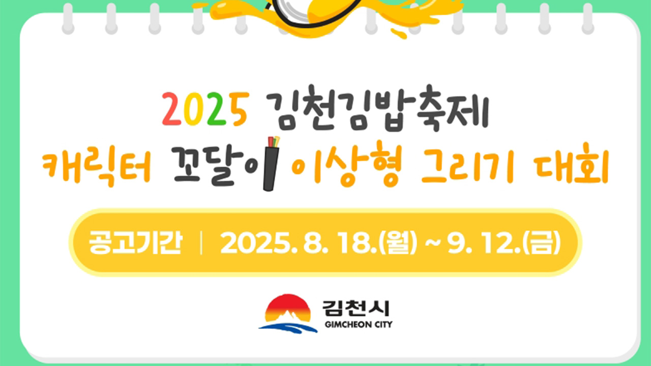 경북 김천시가 김밥축제 캐릭터 '꼬달이'의 이상형 그리기 대회를 엽니다.참가 대상은 김천시에 사는 어린이(2013년 이후 출생자)로, 유치부와 초등학교 저학년, 초등학교 고학년 3개 분야로 나눠 분야별로 5개 작품을 선정합니다. 9월 1일부터 12일까지 네이버 폼에 접속해 참가 신청서와 작품(유치부 8절지, 초등부 4절지...