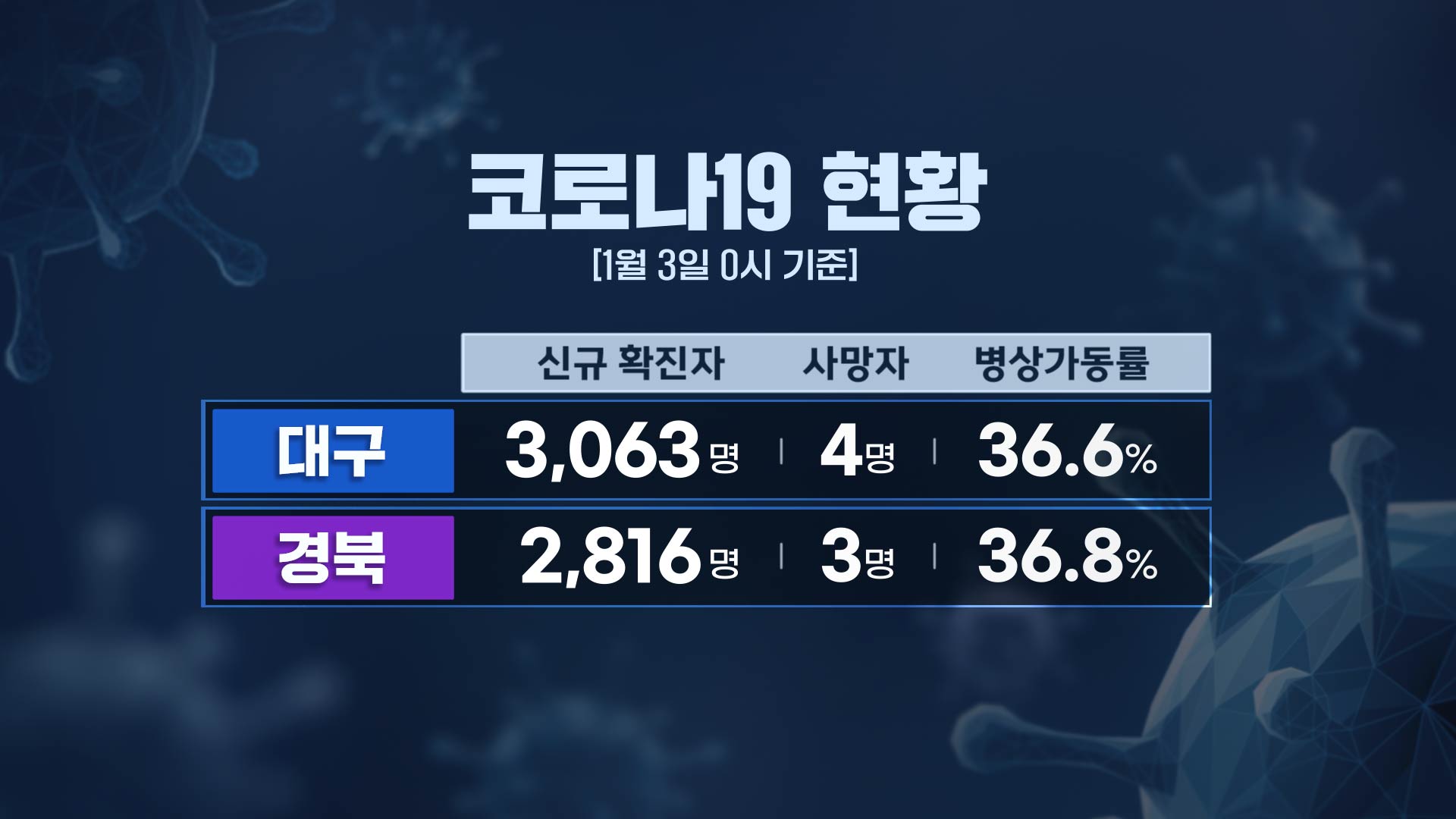 코로나 19 신규 확진자가 대구는 줄고, 경북은 소폭 늘었습니다.1월 3일 0시 기준 코로나 19 신규 확진자는 대구 3,063명, 경북 2,816명으로, 지난주 같은 요일에 비해 대구는 401명 줄어든 반면, 경북은 85명 늘었습니다.사망자는 대구에서 4명, 경북에서 3명 나왔습니다.코로나 19 전담 치료 병상 가동률은 대구 36.6%, ...