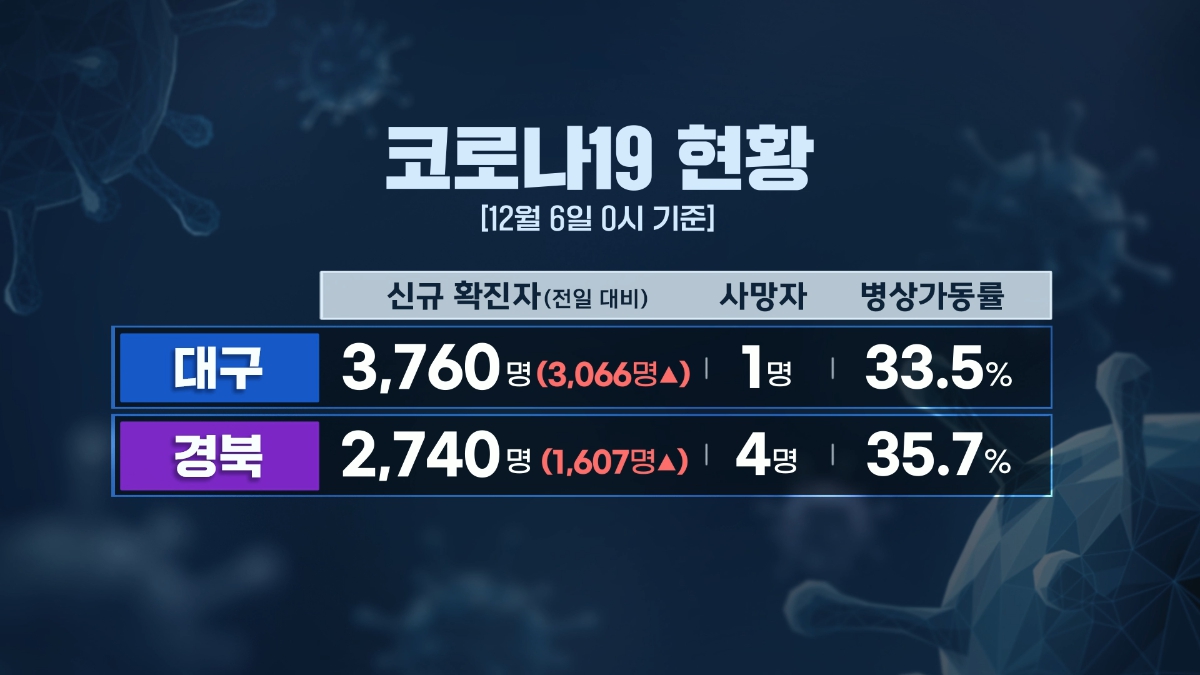 대구와 경북 지역의 코로나19 신규 확진자가 늘었습니다.12월 6일 0시 기준 코로나19 신규 확진자는 대구 3,760명, 경북 2,740명으로 지난주 같은 요일에 비해 대구는 259명, 경북은 69명 늘었습니다.사망자는 대구에서 1명, 경북에서 4명 나왔습니다. 코로나19 전담 치료 병상 가동률은 대구 33.5%, 경북 35.7%입니다.집에...