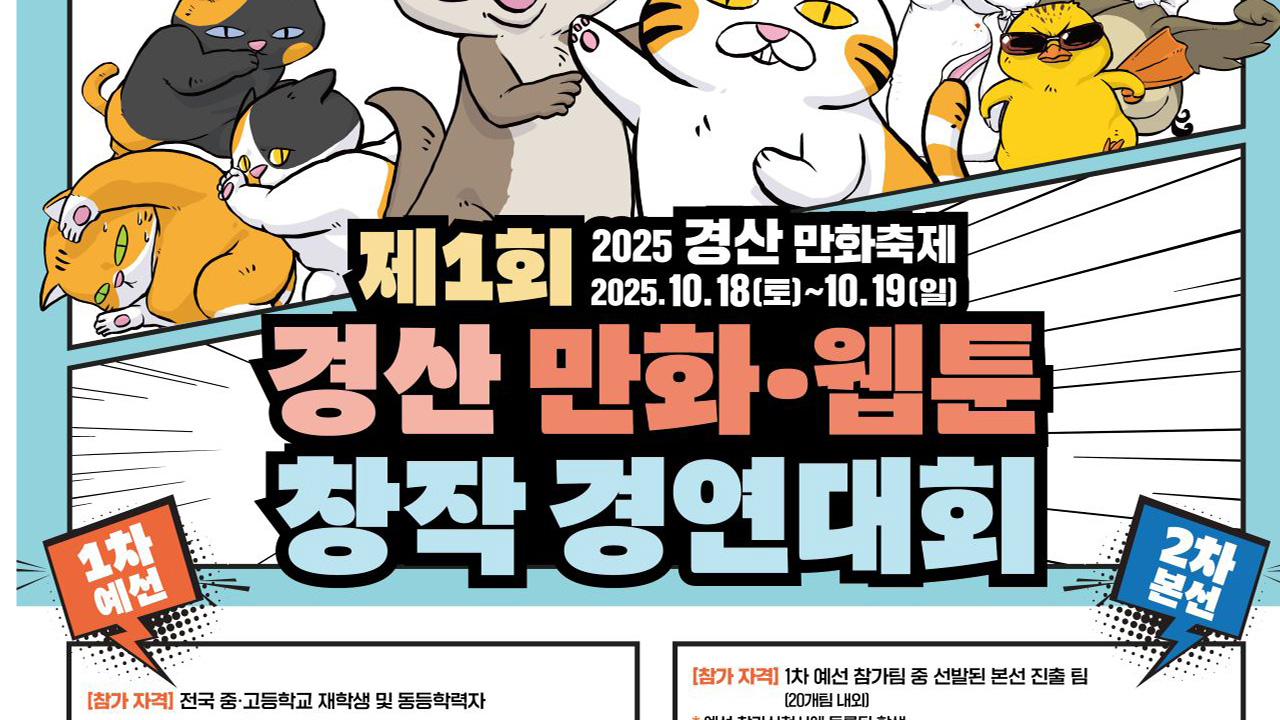 포스터 제공 경북 경산시경북 경산시가 제1회 경산 만화·웹툰 창작 경연대회를 엽니다.이번 대회에는 만화나 웹툰에 관심 있는 중·고등학생이나 같은 나이의 청소년은 누구나 참가할 수 있습니다. 예선 접수는 8월 1일부터 8월 31일까지 구글 폼을 통한 온라인으로 하는데, 참가자는 캐릭터 창작이나 N 컷 만화 중 하나를 ...