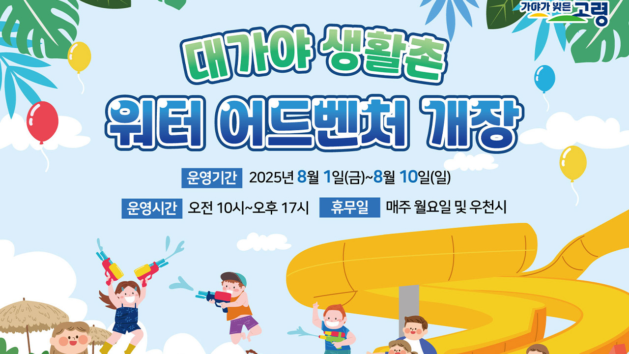 경북 고령군이 8월 1일부터 8월 17일까지 대가야 생활촌 물놀이장을 무료로 운영합니다.운영 시간은 오전 10시부터 오후 5시까지로, 50분 운영과 10분 휴식 방식으로 적용하는데, 월요일과 비가 내리는 날은 쉽니다. 8월 1일부터 10일까지는 대가야 생활촌 워터 어드벤처라는 이름의 별도 행사도 하는데, 이 기간에는 에어...