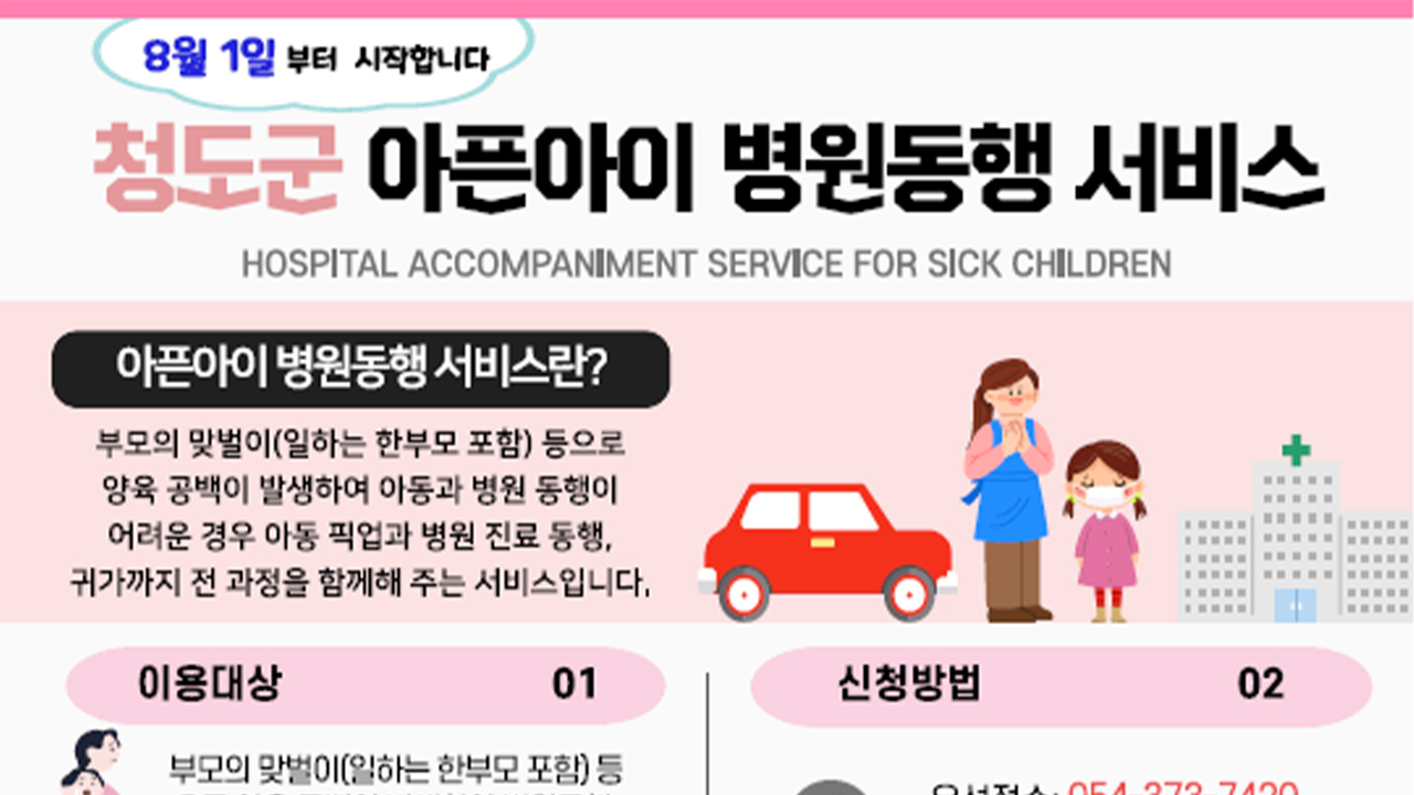 경북 청도군도 8월부터 아픈 아이 병원 동행 서비스를 합니다.청도군은 8월 1일부터 4세 이상(2021년생) 12세 이하(초등학생) 어린이를 대상으로 하는 아픈 아이 병원 동행 서비스를 정식 운영한다고 밝혔습니다. 이 서비스는 맞벌이 부모(일하는 한 부모 포함)가 업무나 급한 사정으로 자녀를 병원에 데려갈 수 없을 때 돌...