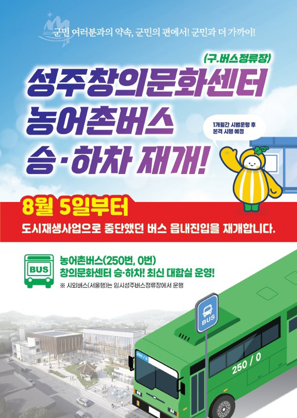 2년간 중단됐던 옛 성주 버스정류장의 농어촌 버스 승·하차가 8월 5일부터 재개됩니다.성주군은 도시재생 1단계 사업을 하는 지난 2년 동안 성주 버스정류장에서의 농어촌 버스 승·하차를 중단하고, 성주읍 외곽지에 임시버스정류장을 운영했지만 8월 5일부터는 옛 정류장에서 버스 승·하차를 다시 한다고 밝혔습니다.성주 ...