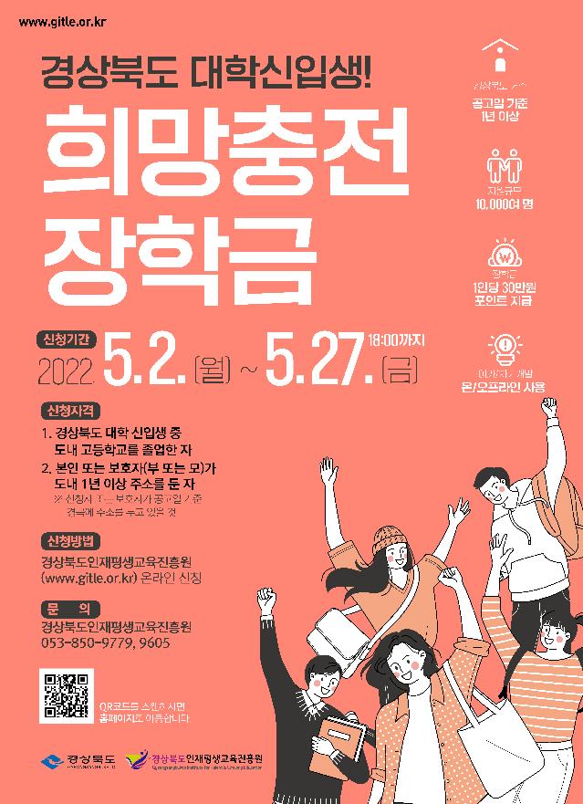 경상북도가 희망 충전 장학금을 받을 대학 신입생을 모집합니다.경북 지역 고등학교를 졸업한 뒤 경북에 주소지를 두고 있으며, 본인이나 부모가 1년 이상 경북에 살고 있는 2022년 경북 지역 대학 신입생은 신청할 수 있습니다.경상북도는 만 명을 선정해 대구·경북 평생교육 가맹점과 문화 여가 활용, 자기 계발 등에 온·...