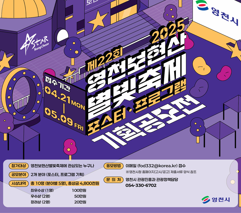 사진 제공 경북 영천시경북 영천시가 제22회 영천 보현산 별빛축제 포스터와 프로그램을 공모합니다. 이번 축제의 주제인 '고리가 아름다운 행성–토성'과 '영천의 별'을 잘 표현한 포스터와 프로그램 기획에 대한 공모입니다. 포스터 분야는 영천 보현산 별빛축제의 정체성을 담아내면서 토성과 별을 주제로 독창적인 디자...