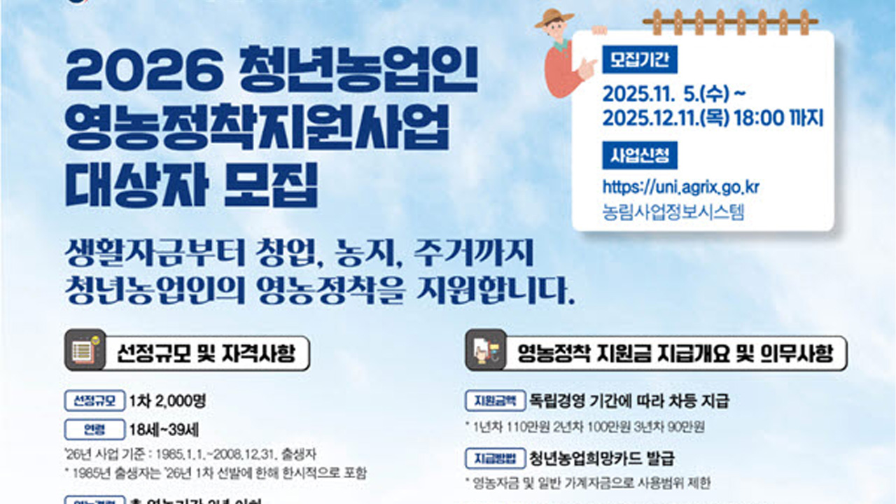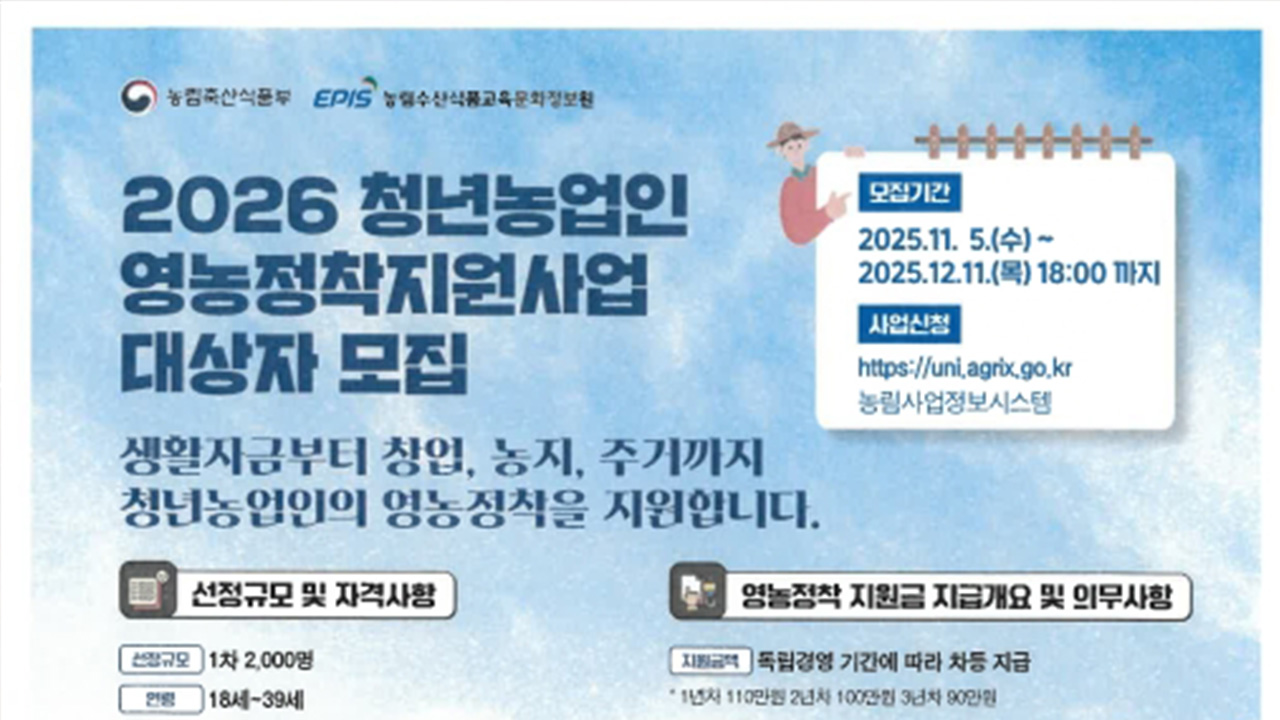경북 영천시가 청년 농업인 영농 정착 지원 사업 신청을 받습니다.이 사업은 영농 초기 불안정한 소득으로 정착에 어려움을 겪는 청년 농업인에게 3년간 월 90만 원~110만 원을 가계 자금으로 지원하는 것입니다. 신청 대상은 18세 이상 39세 이하(1985~2008년생)로 독립 경영 경력 3년 이하이거나 예비 창업농이면 됩니다....