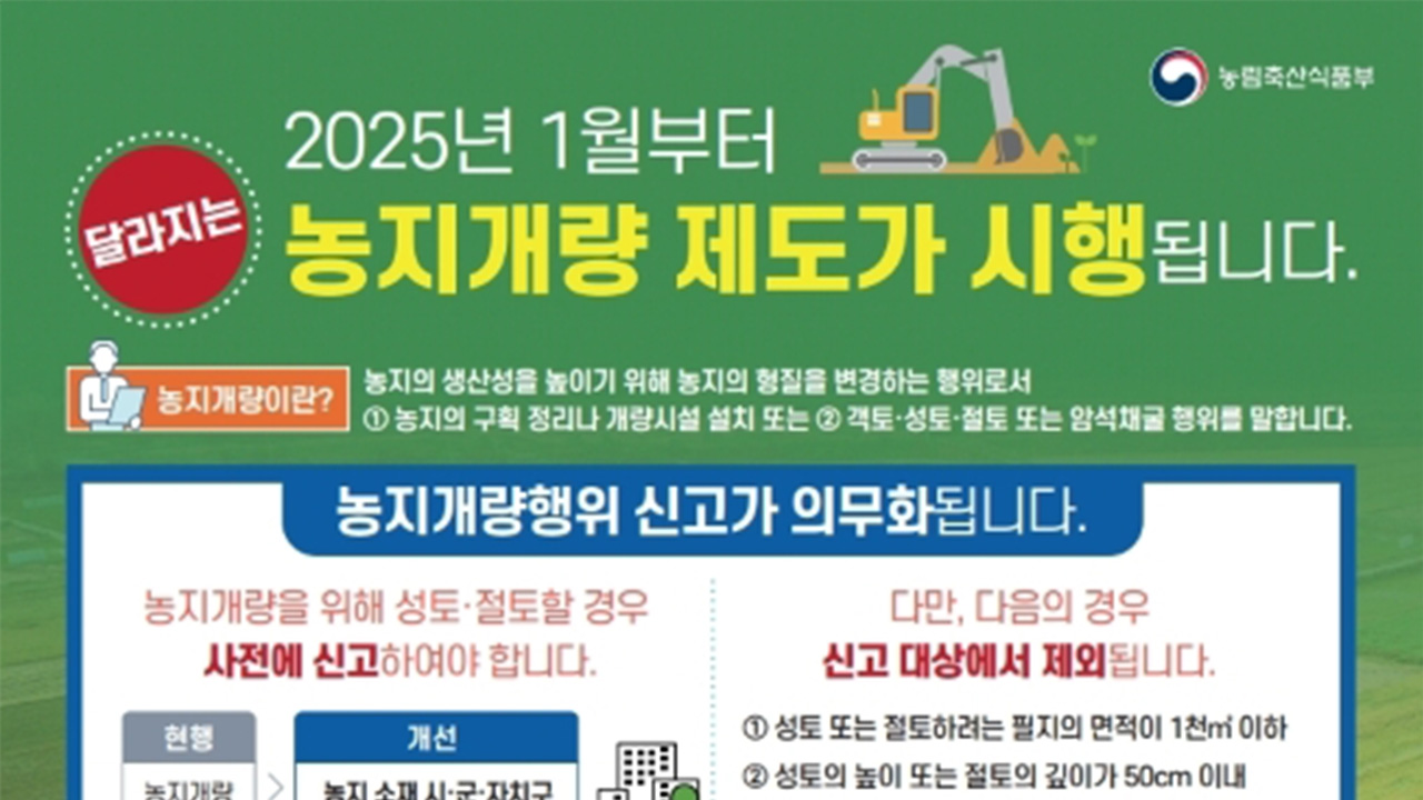 경북 김천시가 농지를 절토하거나 성토할 때 사전 신고가 의무화됐다면서 농업인의 각별한 주의를 부탁했습니다.김천시는 2025년 1월 3일 개정·시행된 농지법에 따라 필지 면적이 1,000㎡를 초과하면서 절토·성토 높이·깊이가 50cm를 초과하는 경우 사전에 농지 개량 행위 신고를 해야 한다고 했습니다. 농지 개량 신고서와...