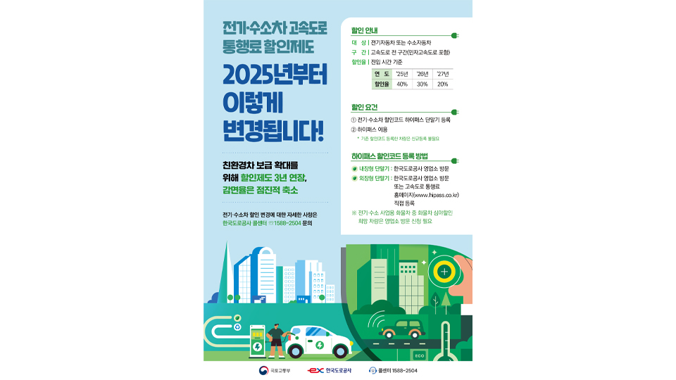 사진 제공 한국도로공사2024년 말에 종료될 예정이던 전기·수소차에 대한 고속도로 통행료 할인이 3년 연장됩니다.한국도로공사는 다만, 할인율은 2025년 40%, 2026년 30%, 2027년 20%로 변경해 적용한다고 밝혔습니다.변경되는 전기·수소차 통행료 할인율은 고속도로 진입 시점 기준으로 적용함에 따라, 2024년 12월 31일...