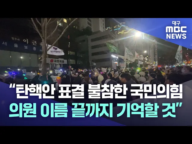 ◀ 앵 커 ▶국민의힘 의원들 불참으로 탄핵안 표결이 무산되자 국민의힘의 정치적 기반으로 불리는 대구·경북에서도 반발의 목소리가 커지고 있습니다.시민들은 "윤석열 대통령 탄핵 방탄에 앞장선 국민의힘 국회의원들의 이름을 끝까지 기억할 것"이라고 했습니다.보도에 서성원 기자입니다.◀ 현장음▶"나가라 나가라 나가라 ...