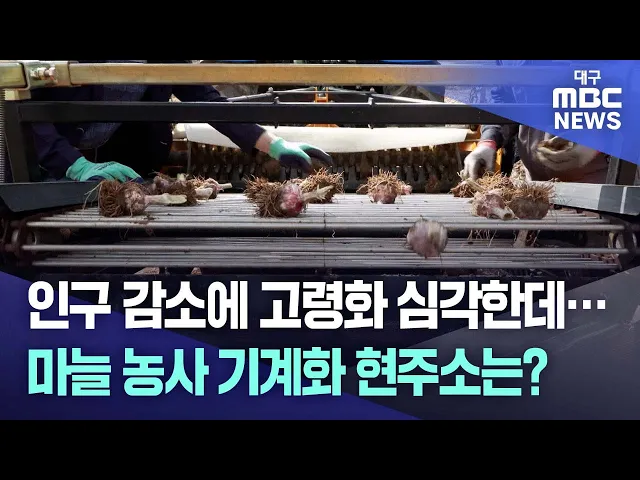 ◀앵커▶인구 감소와 고령화로 인한 농촌의 일손 부족은 어제오늘 일이 아닌데요.그래서, 파종에서부터 수확까지 모든 과정을 기계화하기 위한 시도가 곳곳에서 이뤄지고 있습니다.요즘 수확이 한창인 마늘 농사의 기계화 수준은 어디까지 와 있을까요?서성원 기자가 확인해 봤습니다.◀기자▶경북 영천의 한 마늘밭입니다.농기...
