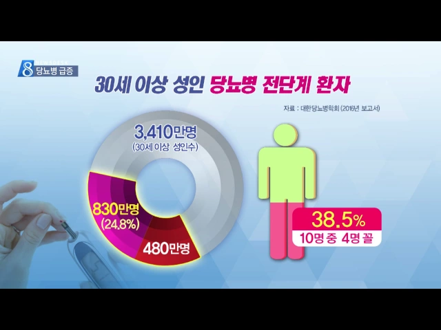 ◀ANC▶ 당뇨병은 우리나라에서 사망 원인 가운데 6번째로 높은 무서운 질환인데, 당뇨병 환자는 준환자를 포함해 천 300만 명을 넘어섰습니다. 대구·경북은 30세 이상 성인의 40%가 당뇨일만큼 심각한데요. 당뇨병의 실태와 대책을 심도있게 알아보겠습니다. 먼저 심병철 기잡니다. ◀VCR▶ ◀END▶ 5년 전 당뇨병 진단...