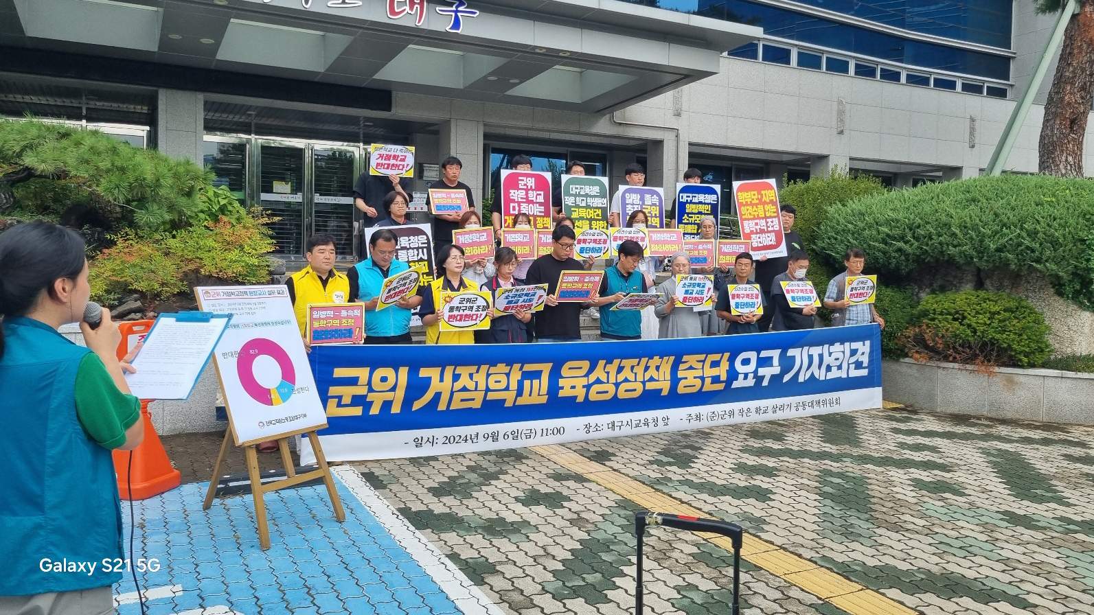 대구시교육청의 군위 거점학교 육성 정책 추진에 지역 주민과 전교조를 비롯한 시민사회단체들이 크게 반발하고 있습니다. 군위 작은 학교 살리기 공동대책위원회는 9월 6일 대구시교육청에서 기자 회견을 갖고 군위 거점학교 육성 정책을 중단하라고 촉구했습니다. 군위 작은 학교 살리기 공대위는 "군위 거점학교 육성 정...