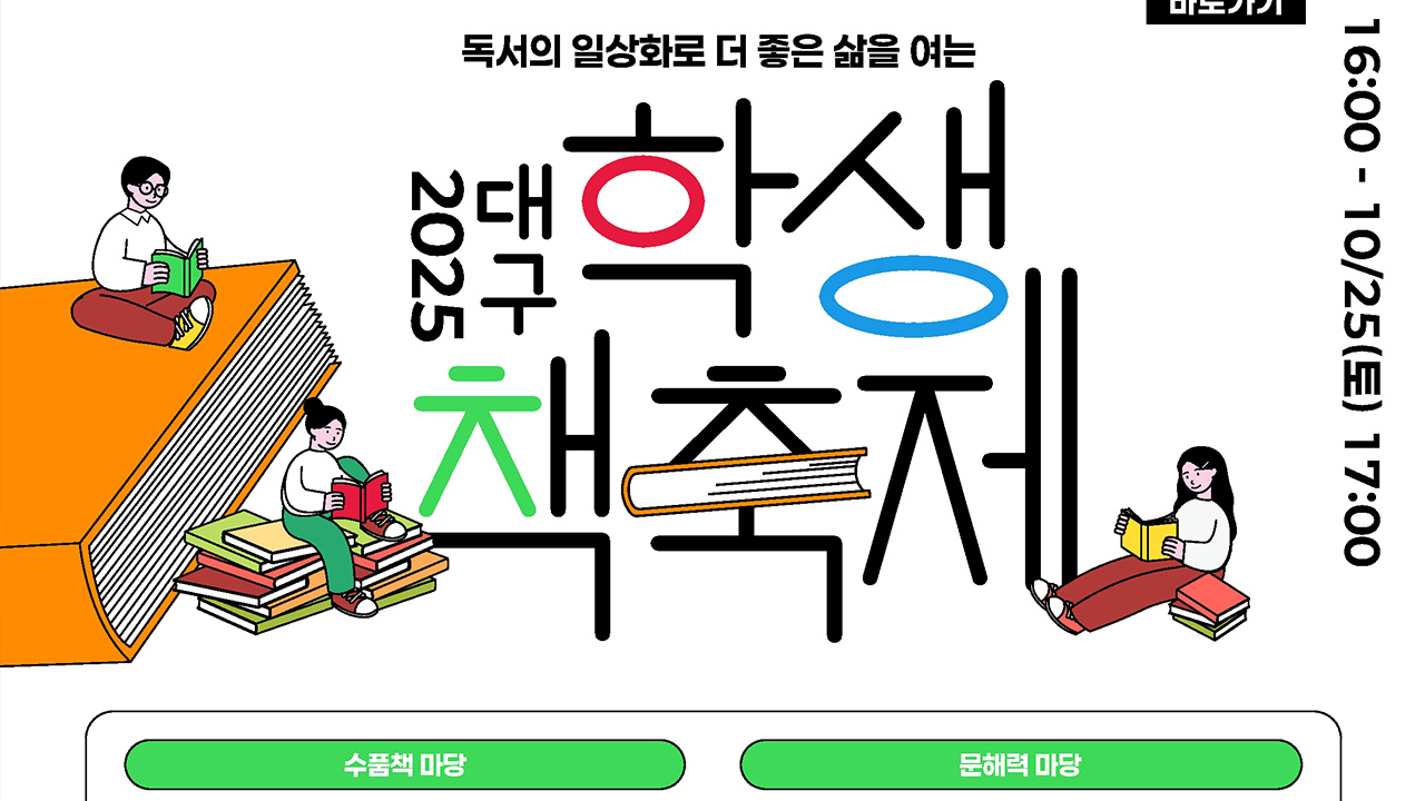 자료 제공 대구시교육청대구시교육청이 학생들의 독서 역량 강화하기 위해 10월 24일부터 이틀간 '2025 대구 학생 책 축제'를 개최합니다.이번 축제는 '내 손의 책, 내 삶의 힘'을 슬로건으로 내걸고, 학생과 교직원, 학부모, 시민이 함께 참여할 수 있는 다채로운 프로그램을 선보입니다. 이번 축제는 문해력, 수품책(수업...
