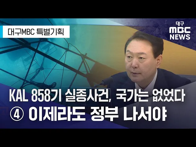 대구MBC 특별취재단이 2020년 1월 미얀마 안다만 해저에서 KAL 858기 추정 동체를 촬영하는 데 성공한 지 4년이 다 돼가지만, 이런저런 이유로 아직도 KAL 858기인지 확인조차 못 하고 있는데요.안민석 더불어민주당 국회의원 "문재인 정부가 기회를 놓친 것은 잘못입니다. 하지만 이것은 보수 정권이나 진보 정권을 떠나서...