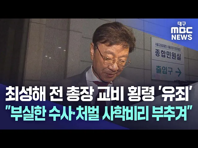최성해 전 동양대학교 총장,'업무상 횡령 혐의' 징역 6개월·집행유예 2년 선고대구문화방송이 교비 횡령 의혹으로 집중 보도한 최성해 전 동양대학교 총장에게 1심 법원이 징역형의 유죄를 선고했습니다.대구지방법원 안동지원 형사2단독 이승운 판사는 업무상 횡령 혐의로 기소된 최성해 전 동양대 총장에게 징역 6개월, ...