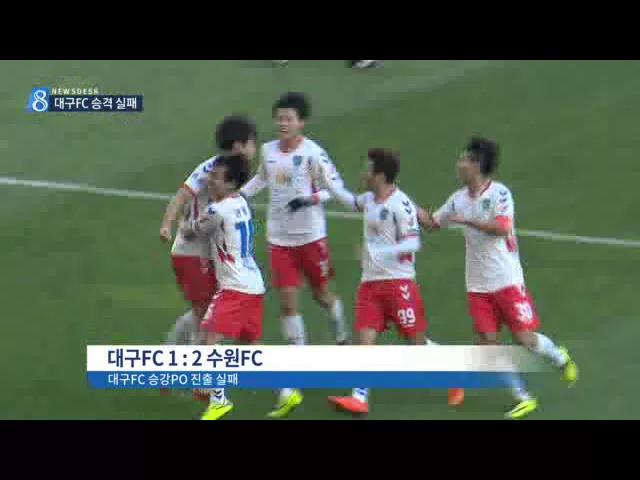 ◀ANC▶ 2015 K리그 챌린지 우승을 아쉽게 놓친 대구FC가 또 하나의 희망이었던 승격도전에도 실패했습니다. 오늘 오후 대구에서 펼쳐진 수원FC와의 플레이오프 경기를 내주며 올시즌 모든 일정을 마무리했는데요. 조나탄과 에델, 세르징요 등 주축 선수들이 빠진 공백이 아쉬움으로 남았던 경기였습니다. 석원 기잡니다. ...