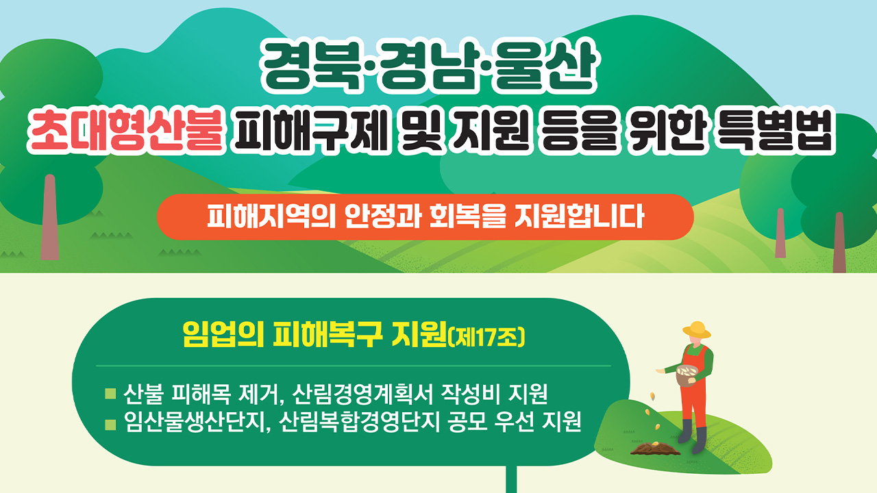 사진 제공 산림청지난 3월 경북·경남·울산에 발생한 초대형 산불로 피해를 본 이들의 구제·지원 방안을 담은 특별법이 10월 28일부터 시행됐습니다.이에 따라 산림청은 피해 지역 임업 종사자들의 시설과 장비, 작물 복구를 지원하고 이들에게 생계비와 임업 직불금 등을 지급합니다. 또 산림경영 특구와 산림 투자 선도 지...