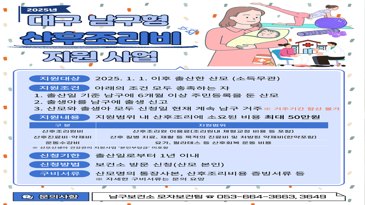 사진 제공 대구 남구대구 남구가 2025년부터 아이를 낳은 산모에게 산후조리 비용으로 최대 50만 원을 지원합니다. 산모가 대구 남구에 살면서 2025년 아이를 낳았다면 소득 수준과 관계없이 지원받을 수 있습니다. 단, 출생아는 남구에 출생신고를 해야 하고, 6개월 이상 산모와 출생아 모두 남구에 살아야 하며, 신청 날...
