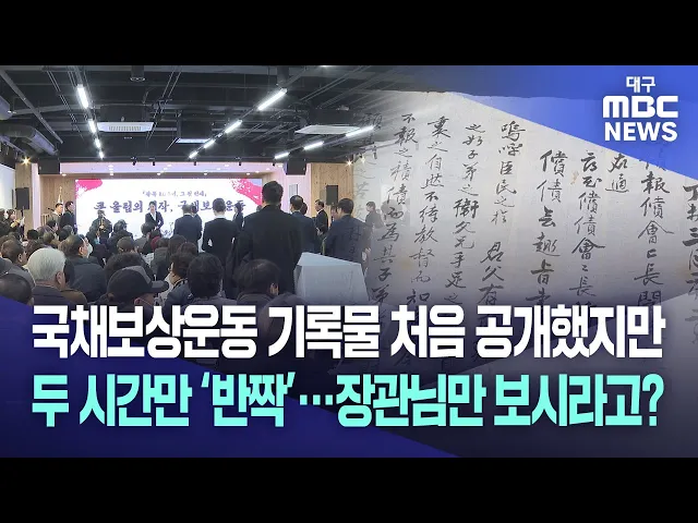 ◀앵커▶대구에서 시작된 국채보상운동이 광복 80주년을 맞아 이달의 독립운동으로 선정됐습니다.1월 23일 특별 행사가 열렸고, 행사에서는 국채보상운동 기록물도 함께 공개됐습니다.그런데 일반인들에게 최초 공개되는 거라던 홍보 내용과는 달리, 정작 일반인들이 볼 시간은 없었습니다.보여주기식 행사가 아니냐는 비판을...