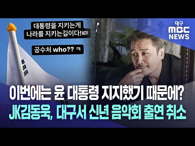 ◀ 앵커 ▶12·3 내란 뒤에도 윤석열 대통령을 옹호한 가수 JK김동욱 씨 대구 공연이 취소됐습니다.해당 공연은 1월 25일, 대구 서구문화회관이 신년음악회로 기획했었는데요. 서구문화회관은 JK김동욱 출연에 대한 항의와 안전상 이유로 취소했다고 밝혔습니다.변예주 기자의 보도입니다.◀ 기자 ▶성조기와 태극기를 든 손, 1...