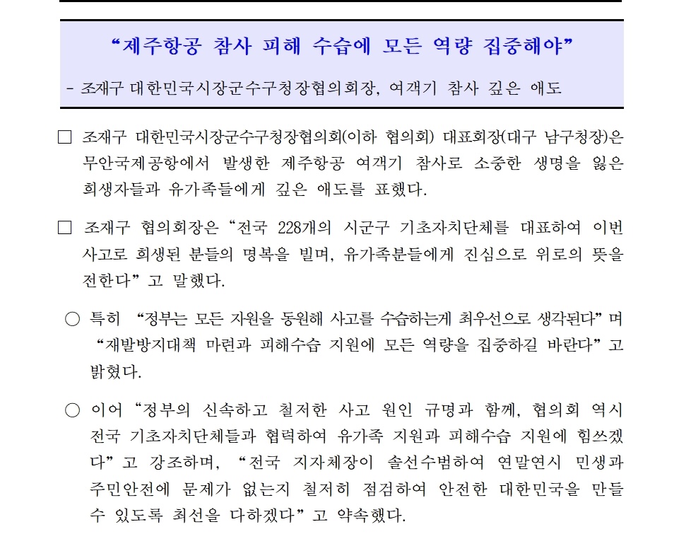 대한민국 시장 군수 구청장 협의회 "깊은 애도···전국 기초자치단체와 지원"